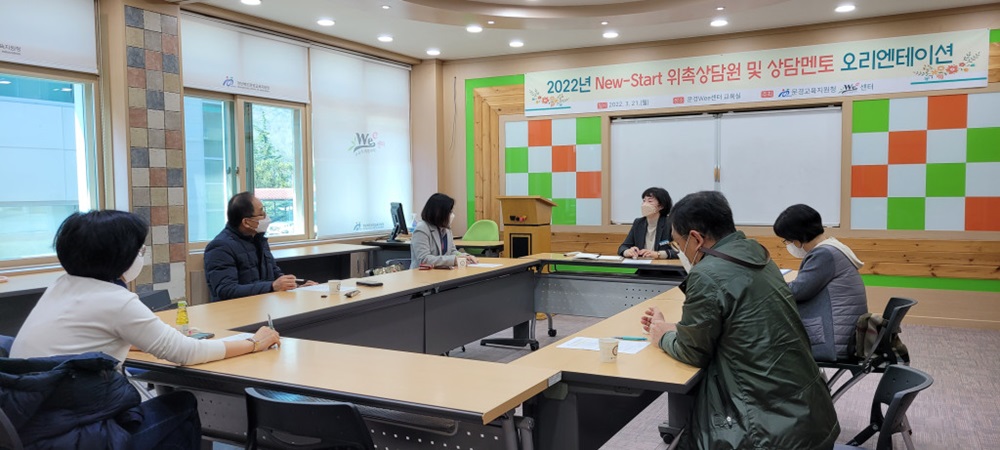 경상북도문경교육지원청(교육장 정진표) Wee센터에서는 2022. 3. 21.(월) New-Start 위촉상담원과 상담멘토를 대상으로 2022년 New-Start 위촉상담원 및 상담멘토 오리엔테이션을 실시하였다.