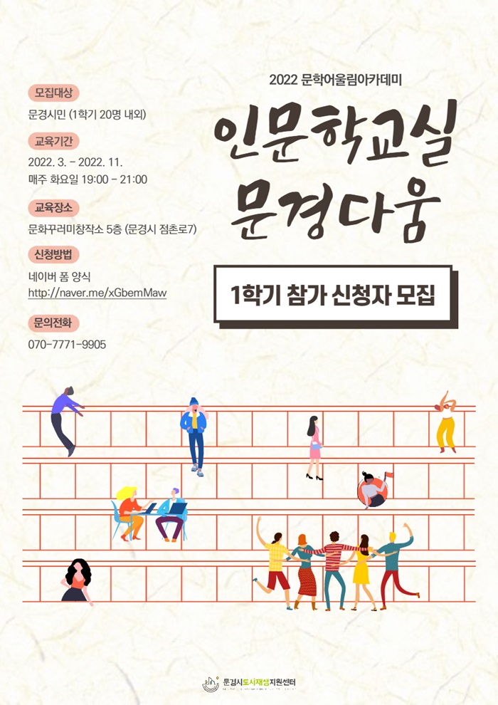 문경시 도시재생지원센터는 2021년에 운영한 ‘굿모닝! 인문학’에 이어 인문학교실‘문경다움’을 진행한다. 4월 첫 주 화요일에 개강하여 1학기 12강, 2학기 12강으로 운영예정이며 현재 1학기 수강생을 모집 중에 있다. 신청은 문경시도시재생지원센터 블로그나 전화(070-7771-9905)를 통해 받고 있다.