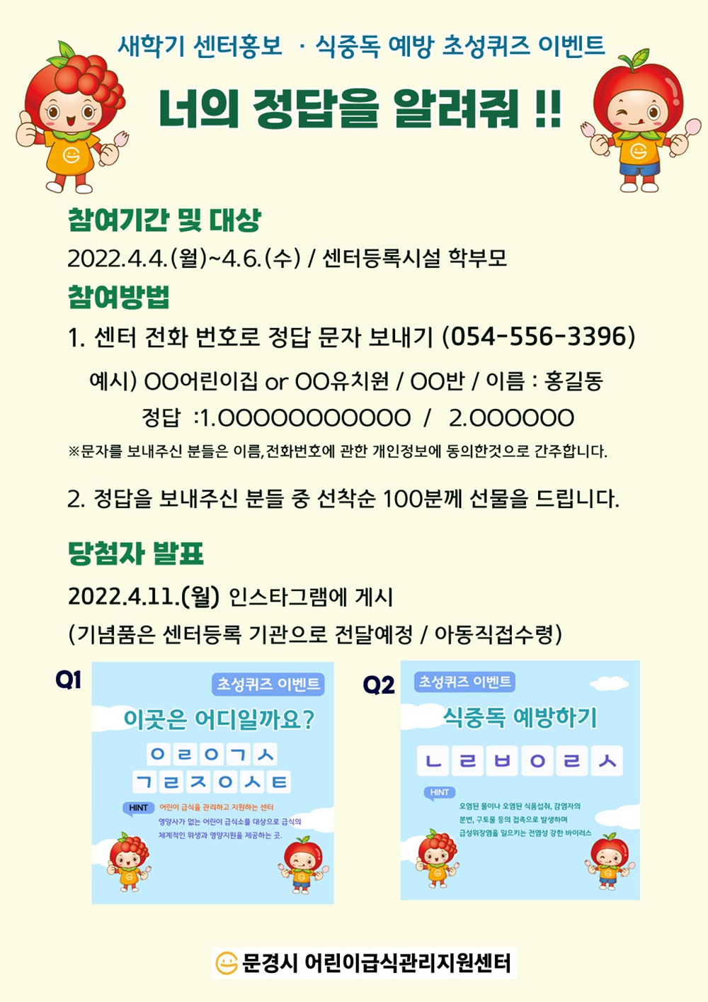 문경시어린이급식관리지원센터(센터장 남정완)는 4월 4일부터 4월 6일까지 3일간 관내 등록급식소 어린이집, 유치원 학부모를 대상으로 너의 정답을 알려줘! 초성퀴즈 이벤트를 진행한다고 밝혔다.