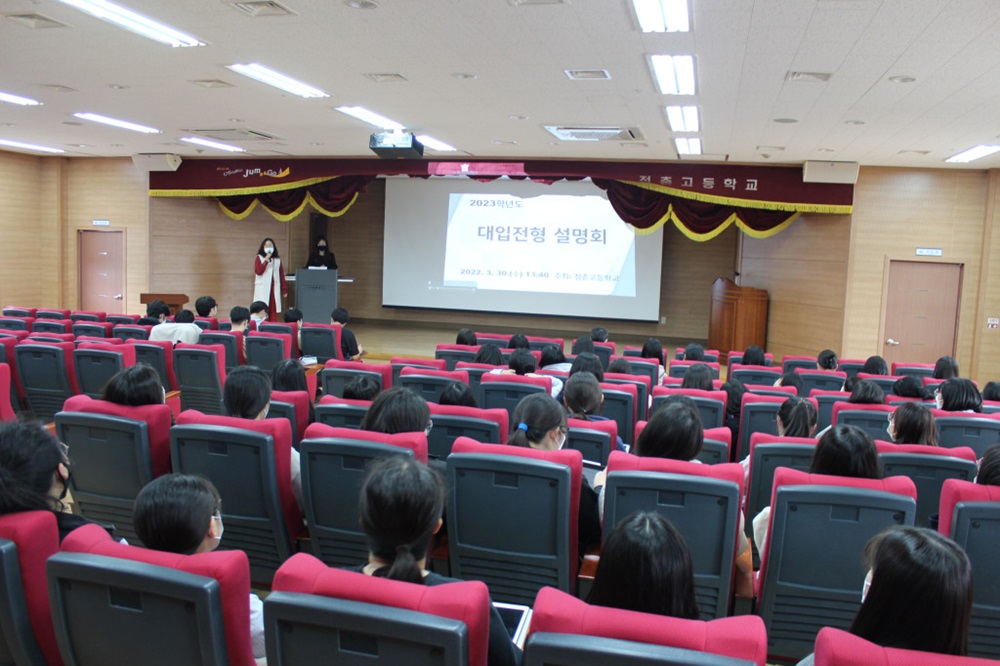 점촌고등학교는 2022학년도에 전교사를 대상으로 대입역량강화연수와 전교생을 대상으로 학년별로 지속적인 대입 전략 설명회, 진로 진학을 위한 캠프 활동 등을 통하여 학생들에게 진로 탐색과 원하는 대학합격에 도움을 주기 위한 특강 계획을 세워놓고 있다. 이번 입시 설명회는 시작 전 참여자들에게 방역수칙을 자세히 안내하였으며, 방역수칙을 철저히 준수하며 실시하였다.