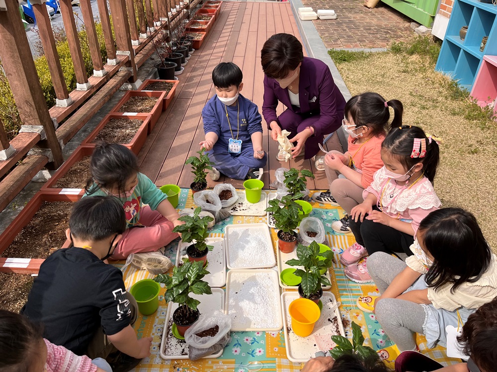 고사리 손으로 유아들은 본격적인 나무 심기 전 커피나무 키우는 법 알아보기, 나만의 식물 이름표 만들기, 화분 꾸미기 등 준비활동을 하였으며 녹색의 푸르름을 뽐내는 커피나무를 나만의 화분에 옮겨 심었다. 한 줌 한 줌 흙을 담고 꼭꼭 누르며 정성을 담아 식물 심기를 하였으며 사랑과 함께 물도 듬뿍 뿌려주었다.