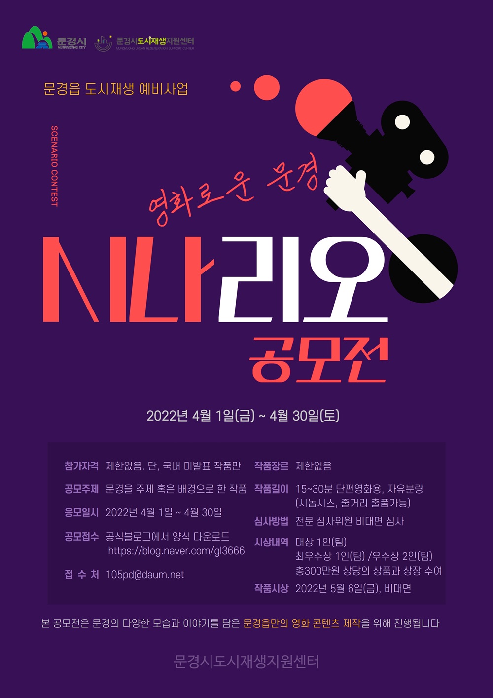 문경시와 문경시도시재생지원센터는 4월 1일부터 4월 30일까지 문경읍 도시재생 예비사업인 『문희경서(聞喜慶瑞) 영화로운 문경생활』의 일환으로 단편영화 시나리오 공모전을 개최한다.