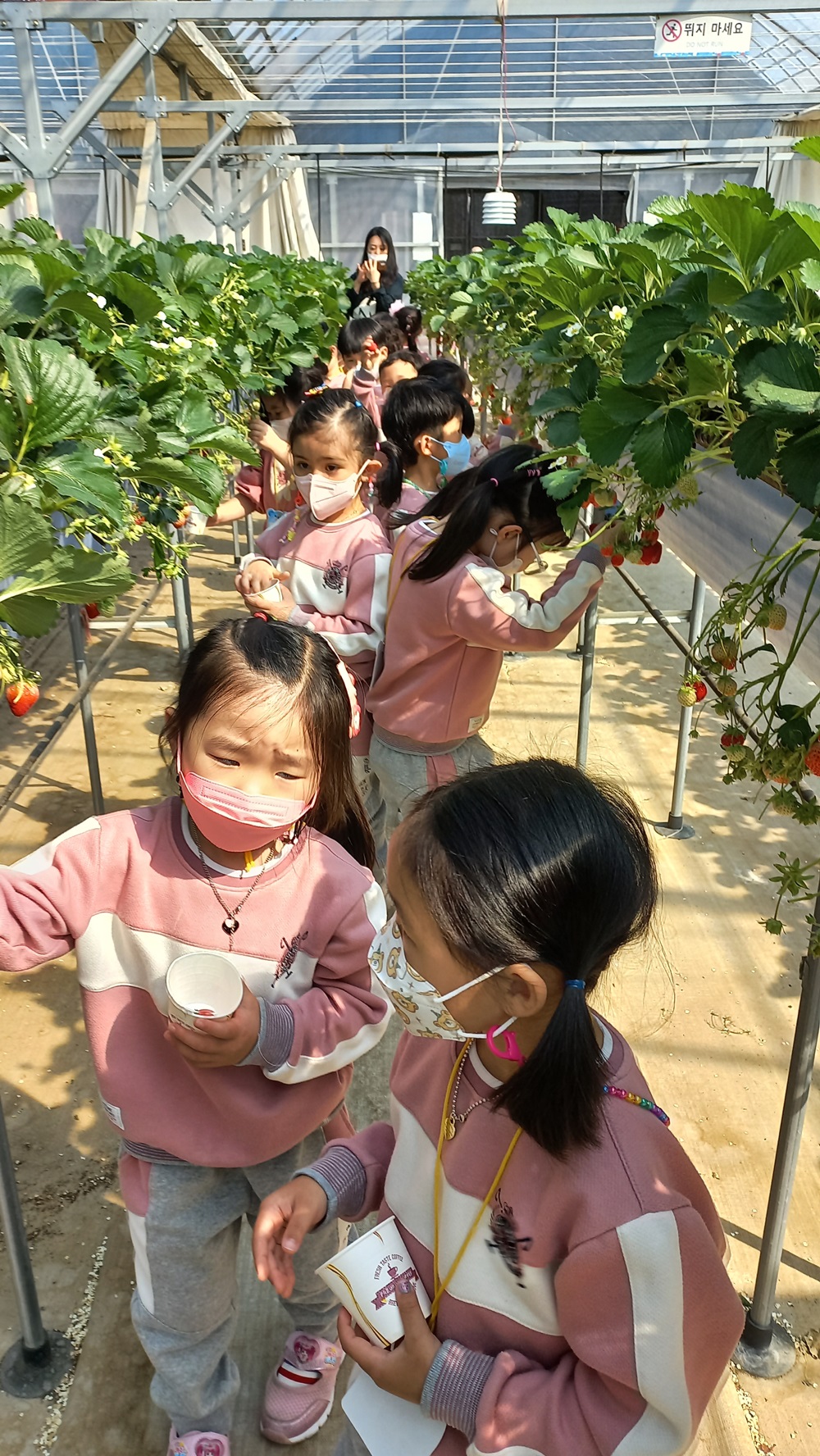 봄 내음 가득한 정원에서 딸기 따는 방법을 농장 아저씨께서 친절하게 유아들에게 설명해주셨다. 깨끗하고 싱싱한 딸기가 탐스럽게 주렁주렁 달려있는 모습을 직접 관찰하고 고사리 같은 손으로 새콤달콤한 딸기를 따 보았다. 호기심 가득한 눈으로 딸기의 꽃과 잎, 열매를 관찰하고 딸기 색깔이 다른 것에 대해 궁금해 하기도 하였다. 빨갛고 탐스러운 딸기를 따며 잘 익은 딸기를 고르기 위해 신중을 기하는 모습도 보였다.