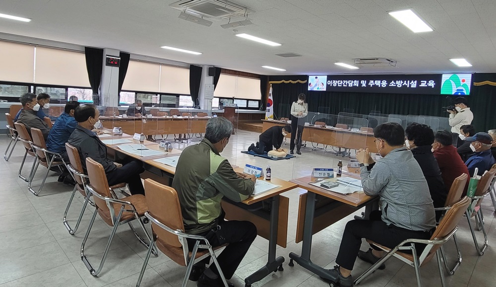 이장회의 전 문경소방서에서 심장정지 및 호흡곤란 발생 시 올바르게 대처하기 위해 우리의 손으로 가족과 주민의 생명을 지킬 수 있는 심폐소생술 응급처치 요령 및 소방설비 화재안전을 위한 소방시설 감지기 교육을 진행했다.