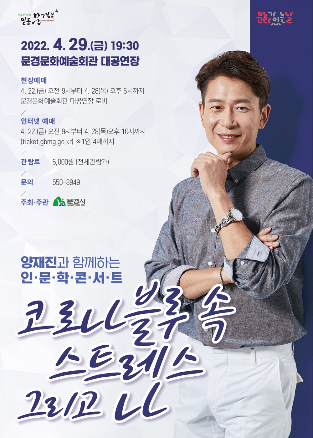 문경문화예술회관은 4월 29일(금) 19:30분 양재진 정신건강의학과 전문의를 초청하여 <코로나블루 속 스트레스 그리고 나>를 주제로 인문학콘서트를 개최한다.