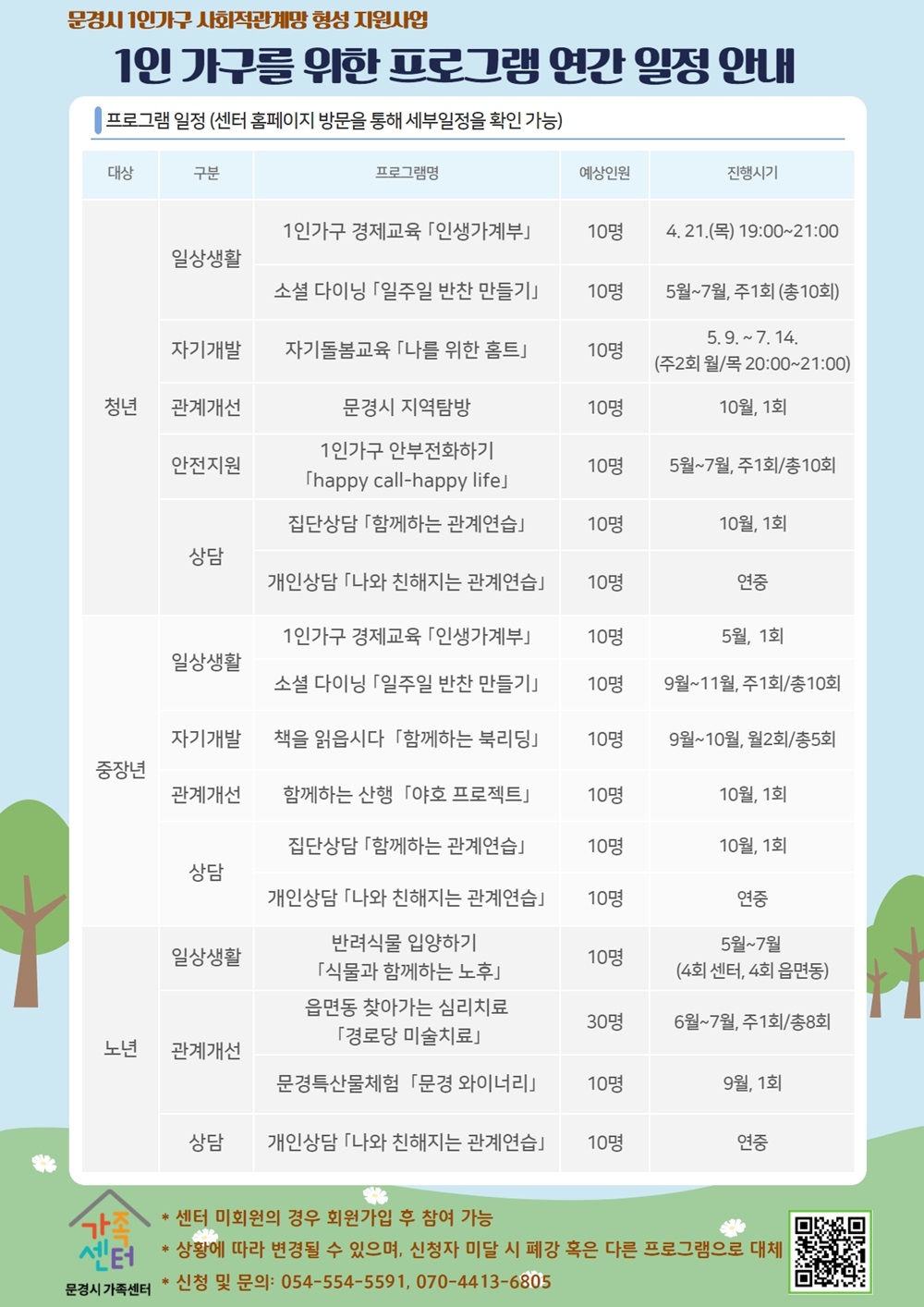 ‣노년: 반려식물입양하기, 문경특산물체험, 경로당미술치료 등을 진행할 계획이다. 또한 개인상담이 필요한 경우 언제든 센터의 상담전문인력을 통해 상담받을 수 있다.