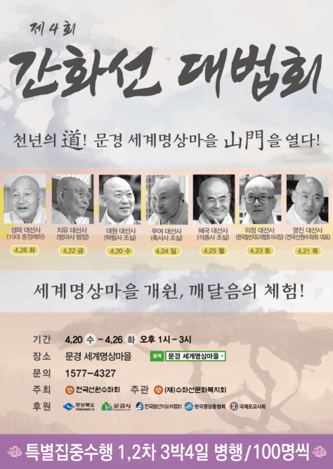 전국 선승과 불자가 한자리에 모여 마음속 진리를 찾는 ‘간화선 대법회’가 4월 20일부터 26일까지 7일간 문경시 가은읍 원북리 봉암사 세계명상마을에서 성대하게 열린다.