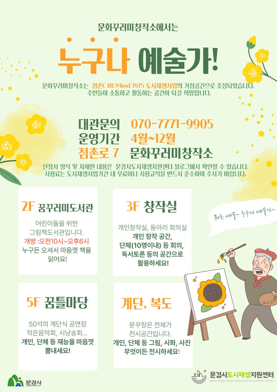 프로그램에 참가를 원하는 분들이나 공간을 대관 하고 싶은 분들은 문경시 도시재생지원센터 블로그를 참고하거나 070-7771-9905~6번으로 문의하면 된다.