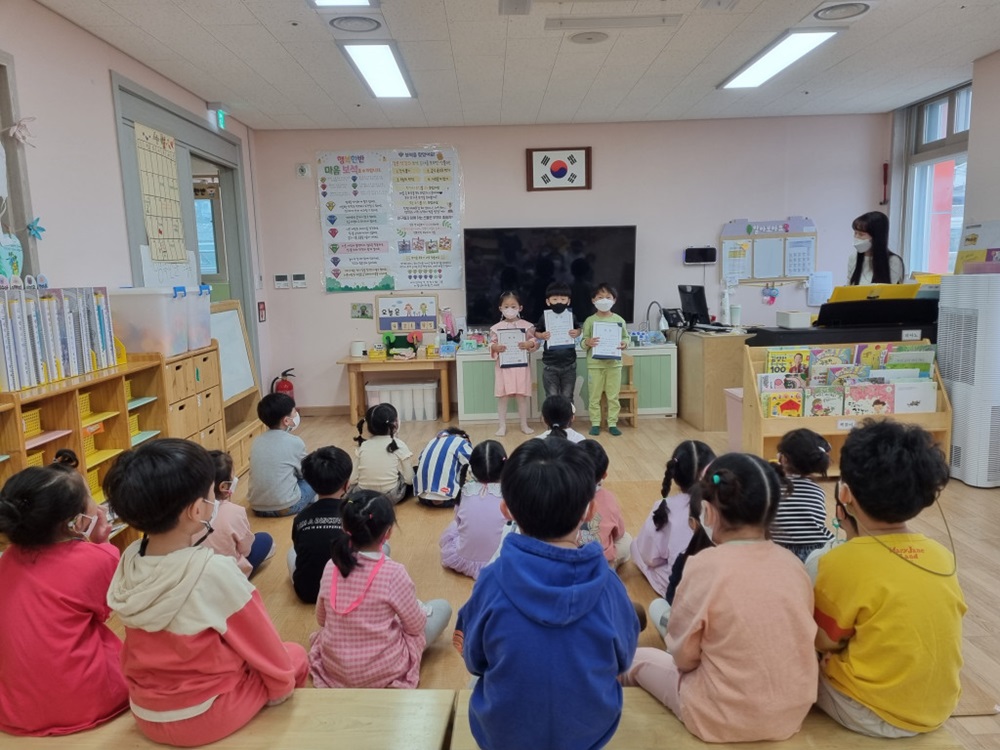 본원에서는 다가오는‘지구의 날’을 맞아 탄소중립의 가치와 중요성 및 의미를 알고 탄소중립 문화를 홍보하기 위하여 학부모와 유아들을 대상으로 탄소중립의 가치와 중요성이 담긴 슬로건을 공모하였다. 응모된 슬로건 중 10편을 선정한 후, 학부모와 교직원의 투표로 가장 많은 표를 받은 순으로 으뜸상(1편), 버금상(3편), 한걸음상(6편)에는 상장과 상품을 수여하기로 하였다. 으뜸상으로 선정된 행복한반 김○○ 가족이 낸 ‘내가 줄인 탄소 하나, 늘어나는 생명 하나’ 슬로건은 현수막으로 출력하여 유치원 차량 및 교문에 붙여 홍보하기로 하였다.