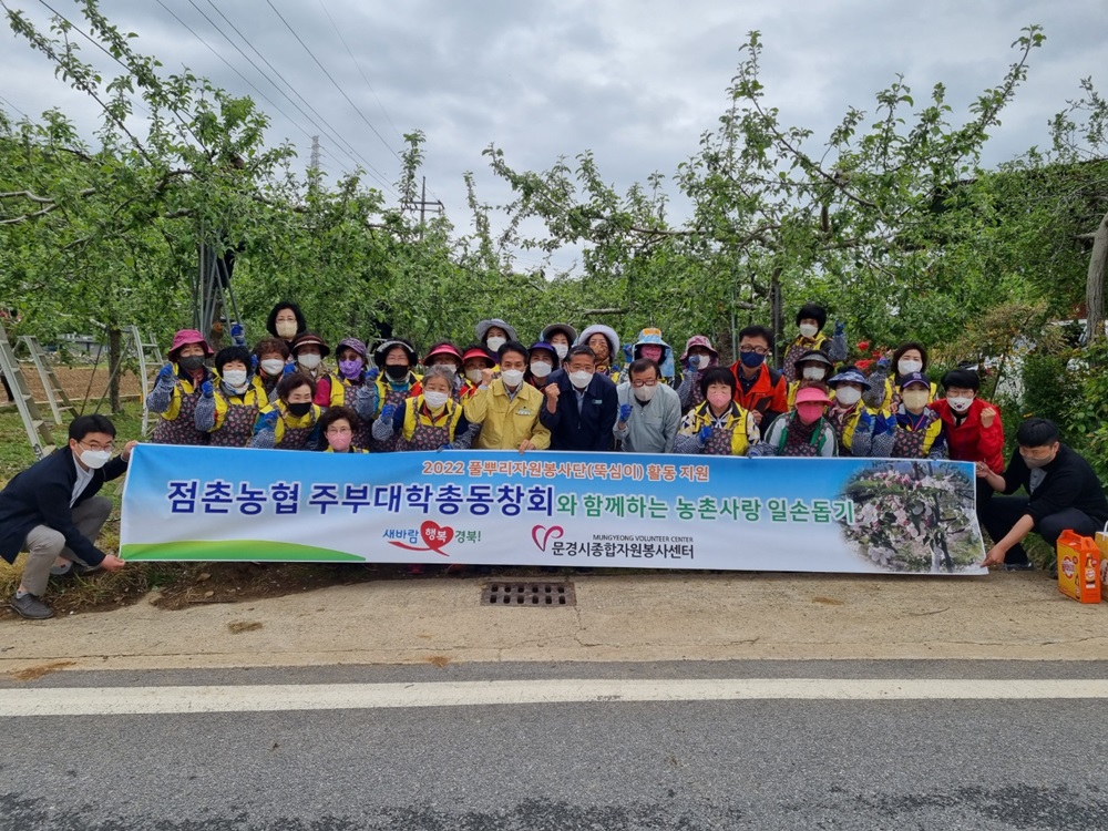 문경시종합자원봉사센터(센터장 김재윤)는 점촌농협주부대학총동창회(회장 이성자)와 연계 하여 4월 29일 문경시 신기동 사과 농장에서 사과적과 일손돕기에 나섰다.