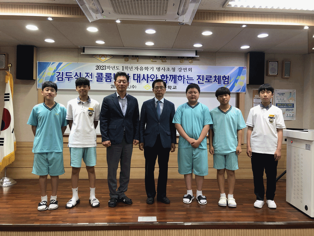 문경 점촌중학교(교장 이현석)는 지난 6월 7일, 1학년 학생들을 대상으로 전 콜롬비아 대사 김두식 강사를 초빙하여 진로 특강을 개최하였다.