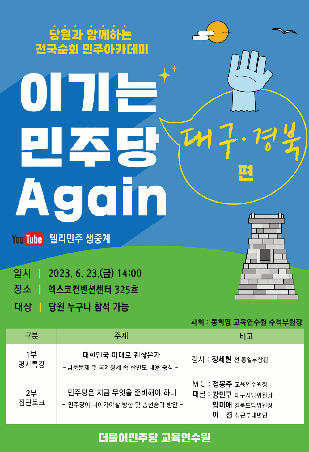 더불어민주당 교육연수원(원장 정봉주)이 주최하는 ‘당원과 함께하는 전국순회 아카데미 이기는 민주당 어게인(Again) 대구경북편’이 오는 23일 오후 2시 대구엑스코 컨벤션센터에서 개최된다.