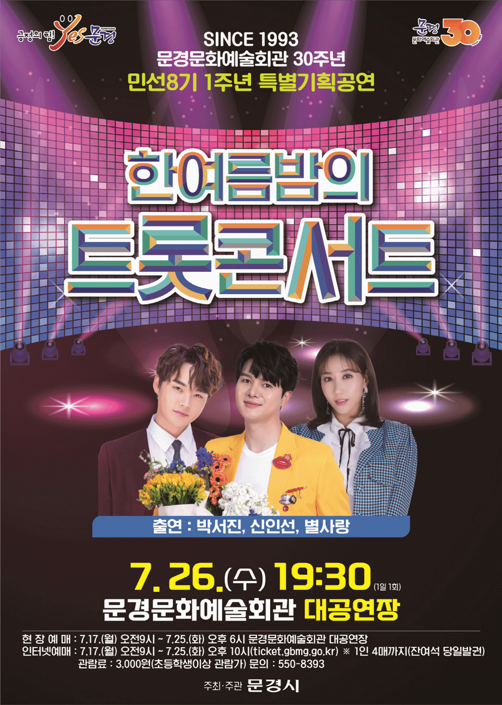 문경시는 가족, 친구들이 함께 즐기고 여름 무더위를 확 날려버릴 한여름밤의 트롯콘서트를 7월 26일과 27일 양일간 문경문화예술회관 대공연장에서 개최한다고 밝혔다.