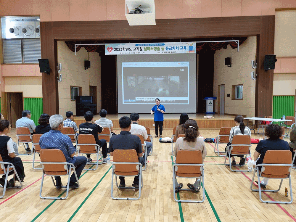 호계초등학교(교장 조용태)는 2023년 7월 10일(월) 본교 꿈나래관에서 교직원을 대상으로 대한안전연합의 전문 강사를 초빙해 심폐소생술 등 응급처치 교육을 실시하였다.