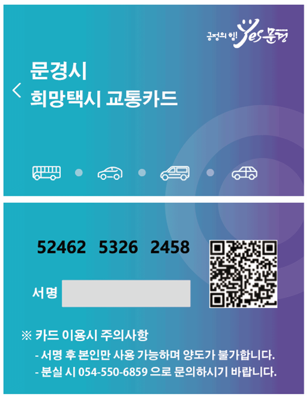 문경시 관계자는 “앞으로 희망택시 이용 시 NFC카드를 꼭 소지하고 탑승하시길 바라며, 대중교통 소외 주민들이 희망택시를 좀 더 공평하고 편리하게 이용할 수 있도록 최선을 다하겠다”고 밝혔다.