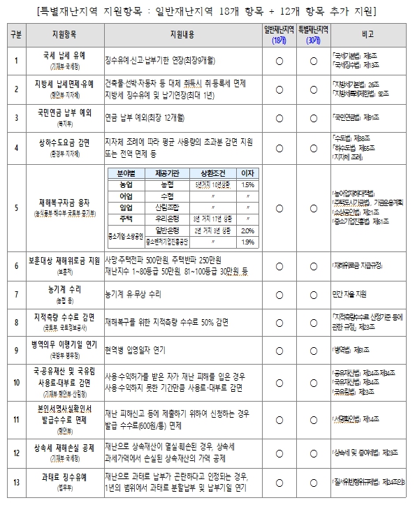 특별재난지역에 대한 지원항목을 아래와 같이 발표