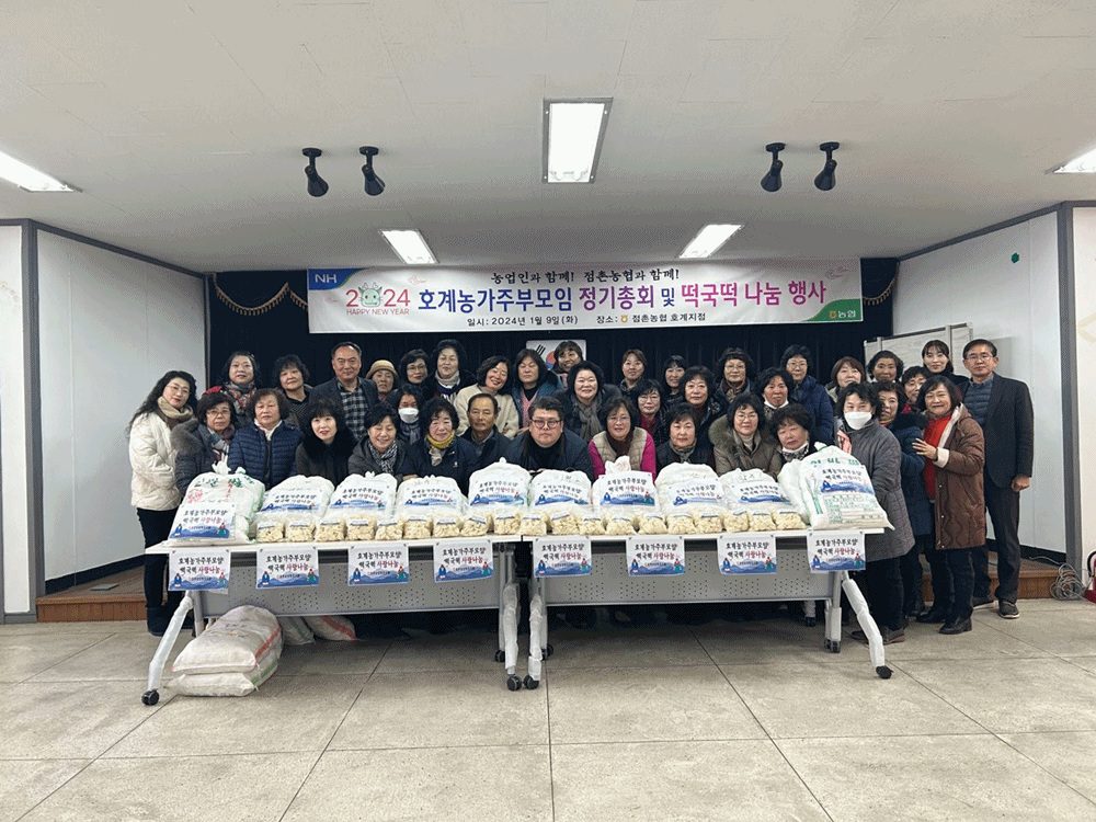 점촌농협 김욱현 조합장은 “고령어르신들을 위해 떡국떡 나눔행사를 준비해 주신 호계농가주부모임 회장님과 임원 및 회원 모두에게 감사의 인사를 전하며, 고마운 마음을 담아 고령어르신들께 잘 전달되어 힘든 시기에 따뜻한 온정을 느끼시면 좋겠다”라며 “앞으로도 호계농가주부모임이 봉사단체로서 활성화 될 수 있도록 적극적인 지원을 아끼지 않겠다”고 말했다.