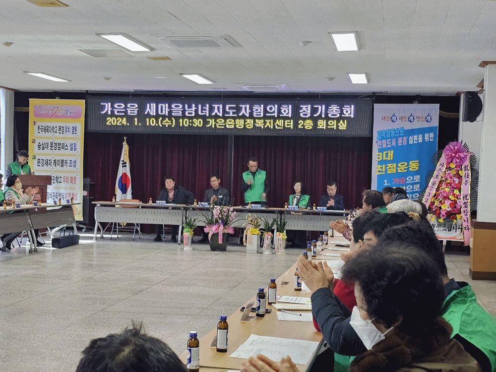가은읍 새마을회(협의회장 박대환, 부녀회장 김진숙)는 가은읍 행정복지센터에서 지난 10일(수) 남·여 지도자 약 50명이 참석한 가운데 2024년 가은읍 새마을회 정기총회를 개최했다. 총회는 신년사, 협의회장 이·취임식, 전임 회원 감사장 전달, 신임 회원 인준서 수여식 및 2024년 신규 사업계획 보고회 순으로 진행되었다.
