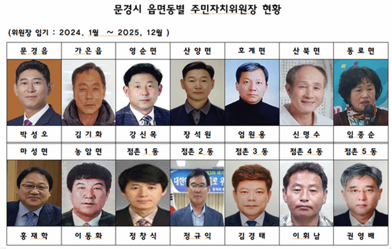 문경시, 읍면동별 주민자치위원장 현황 - 임기 2024년 1월 ~ 2025년 12월