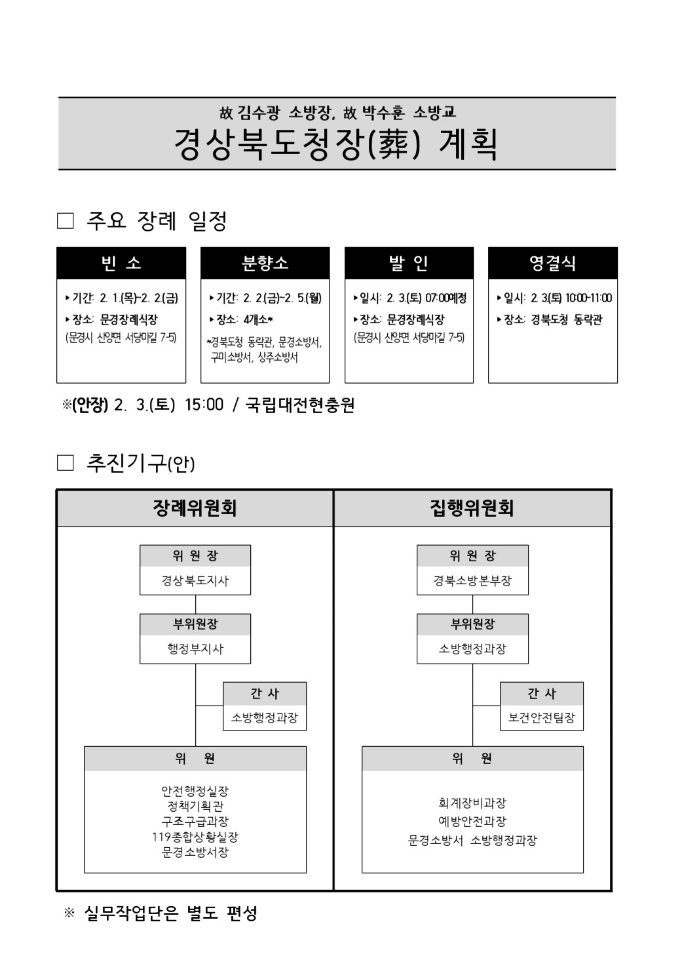 경상북도는 지난 31일 발생한 문경 육가공 공장 화재진압 및 인명 구조활동 중 순직한 문경소방서 소속 소방관 2명(故 김수광 소방장, 故 박수훈 소방교)에 대한 경북도청장 장례위원회를 구성했다.