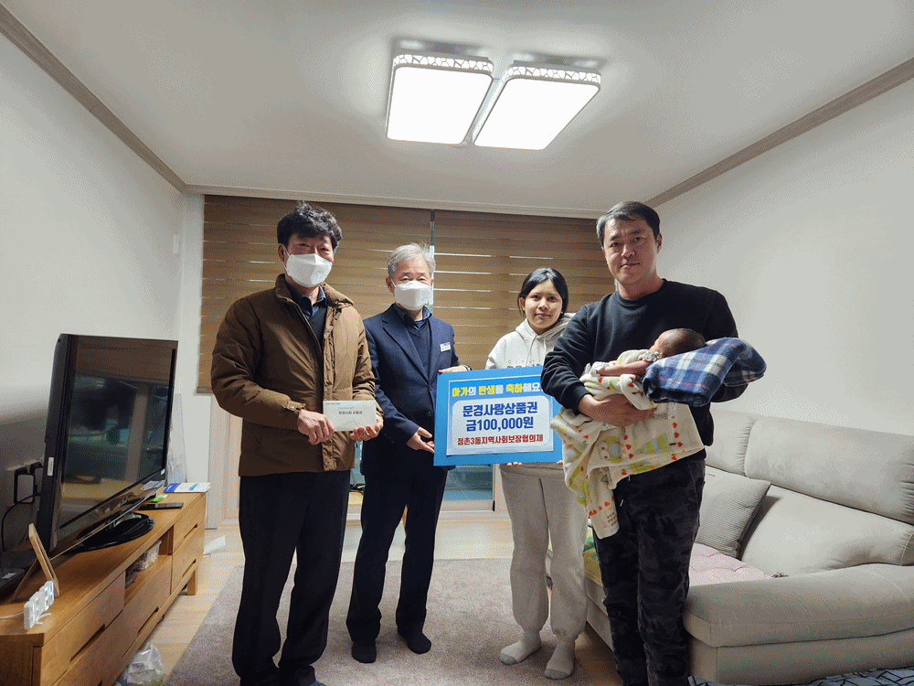 이번 사업은 저출산 시대 출산 장려 분위기를 조성하고 건강한 출산의 기쁨을 함께 나누기 위해 출생을 축하하는 의미로 문경사랑상품권 10만 원을 지원하는 사업이다. 지원 대상은 2024년에 태어나 점촌3동에 주소를 둔 출생 아동으로, 올해는 현재까지 5명의 관내 출산가정에 지원했다.