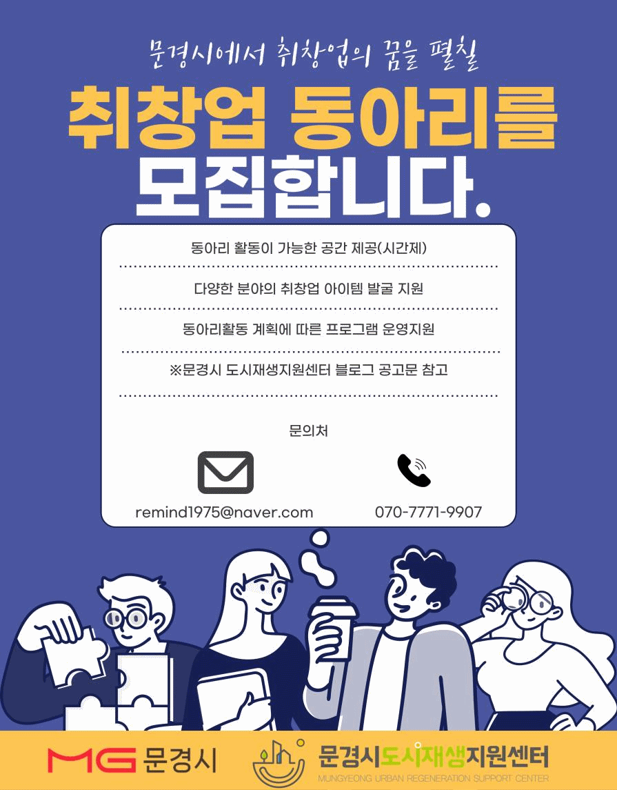 문경시도시재생지원센터 윤효근 센터장은 “이번 사업을 통해 지역 내 취·창업 활동을 고민하는 청년들을 지원하고, 청년들의 새로운 아이디어와 협업을 통해 지역 경제 활성화에도 도움이 되기를 기대한다”라고 밝혔다.