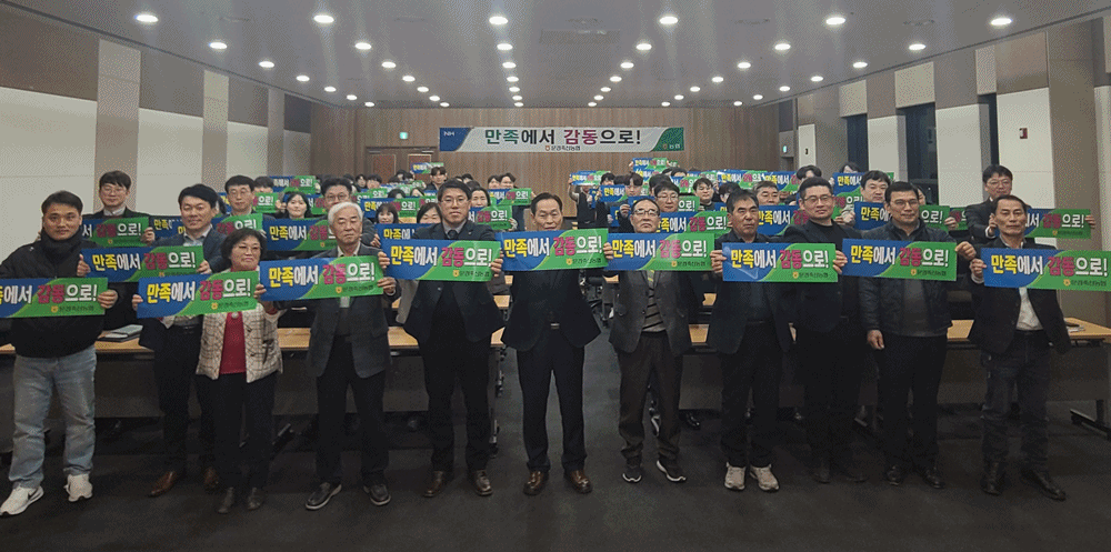 지난 28일 문경축산농협 임직원 100여명은 문경약돌축산물센터 2층 회의실에서 ‘만족에서 감동으로’ 라는 슬로건을 내걸고 차별화된 친절 서비스를 제공하는 문경축산농협을 만들기 위한 친절운동 퍼포먼스를 펼쳤다.