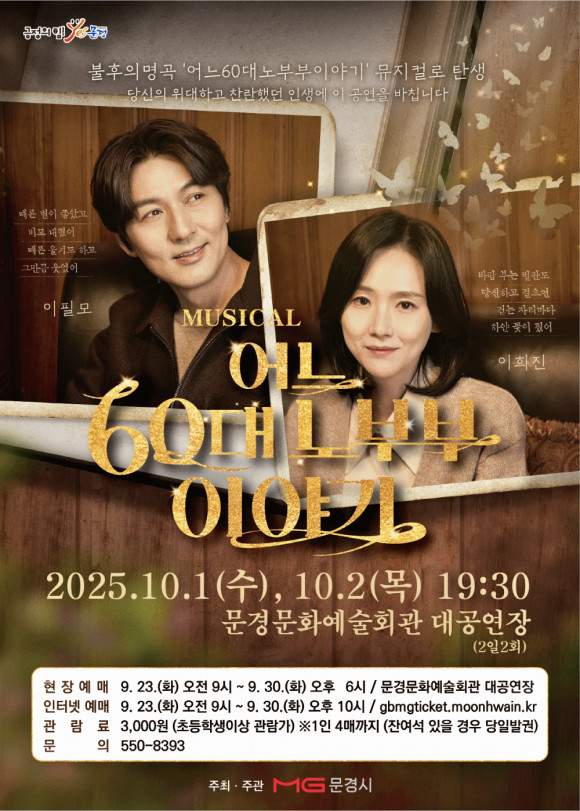 문경시는 평범하지만 특별한 우리들의 가족 이야기로 대학로에서 많은 사랑을 받았던 뮤지컬‘어느 60대 노부부 이야기’공연을 10월 1일(수) 19:30, 2일(목) 19:30에 문경문화예술회관 대공연장에서 선보인다.