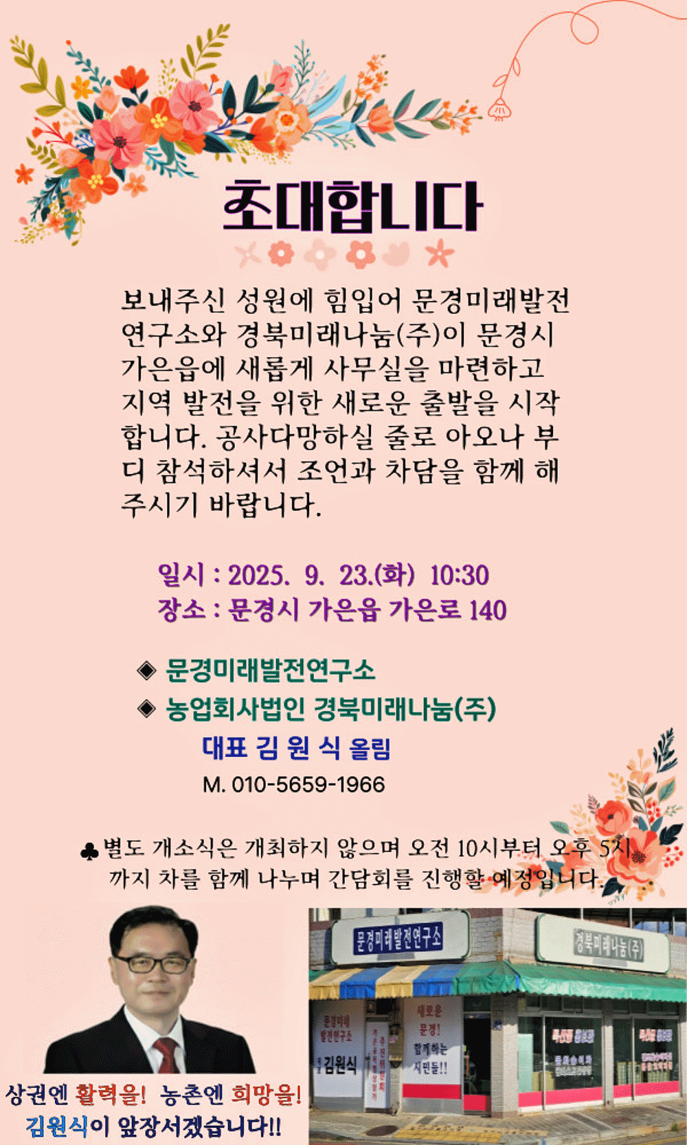 문경미래발전연구소(문미연)와 농업회사법인 경북미래나눔(주) 대표를 맡고 있는 김원식 대표가 9월 23일(화) 문경시 가은로 140번지에서 문미연 사무실과 문경특산품 홍보관을 개설하며 본격적인 지역 봉사 활동을 시작한다고 밝혔다.