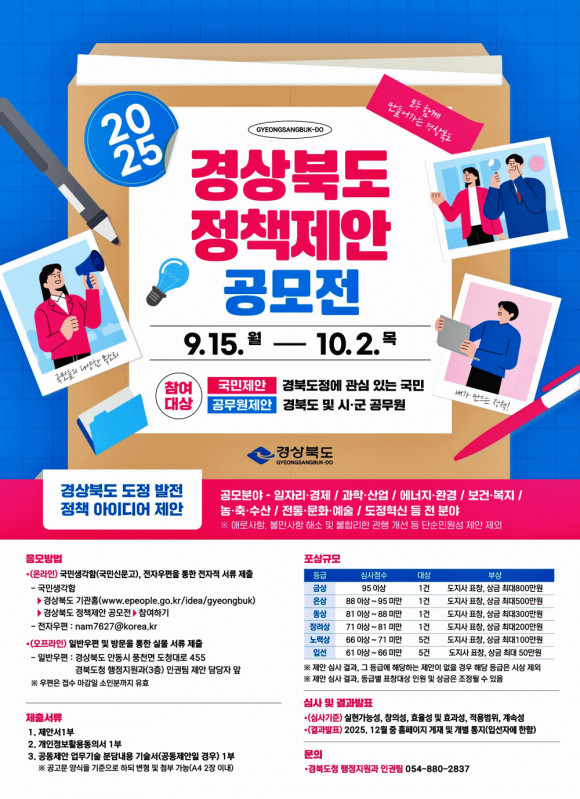 경상북도는 9월 15일부터 10월 2일까지 다양하고 창의적인 아이디어를 발굴해 도정 발전과 제도 개선에 반영하기 위해 ‘2025년 경상북도 정책 제안 공모전’을 개최한다.