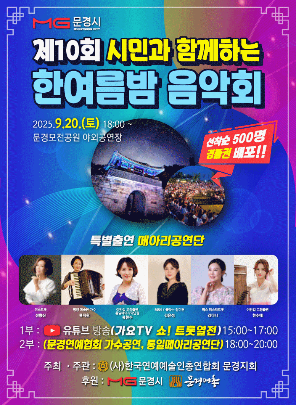 사단법인 한국 연예 예술인 총연합회 김종희 문경지회장 주관으로 문경시청 (뒤) 모전공원에서 오는 9월 20 (토)요일 오후 6시부터 1부 식전공 mc. 밤실양 진행으로 연예협회 소속된가수 고찬도..윤지영..정희열. 색소폰연주 박봉조.임난규. 한연주.신상우, 신선아. 장병원. 윤경애. 김충모. 마성편 문경예총 주관하는 어울림 한마당에서 (가수될상) 수상한 김성숙씨등 문경시 각종행사 출연하여 다양한 실력으로 함께웃고 즐거운시간을 같이한 봉사 활동하는 회원과함께 시작하며 2부 행사에는 초대가수와함께 K트롯=3.출연한 가수와함께 다양한 공연을펼친다.