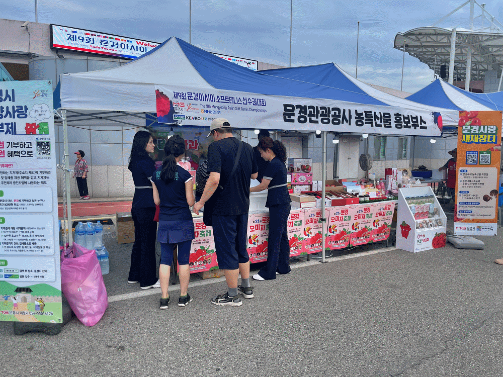 문경관광공사(사장 신필균) 농특산물 직판장은 9월 15일 문경시민운동장에서 열린 ‘제9회 문경 아시아소프트테니스 대회’ 개회식에 홍보부스를 운영하여 대회장을 찾은 국내외 선수단과 관람객들을 대상으로 문경시 농특산물과 관광지를 소개했다.