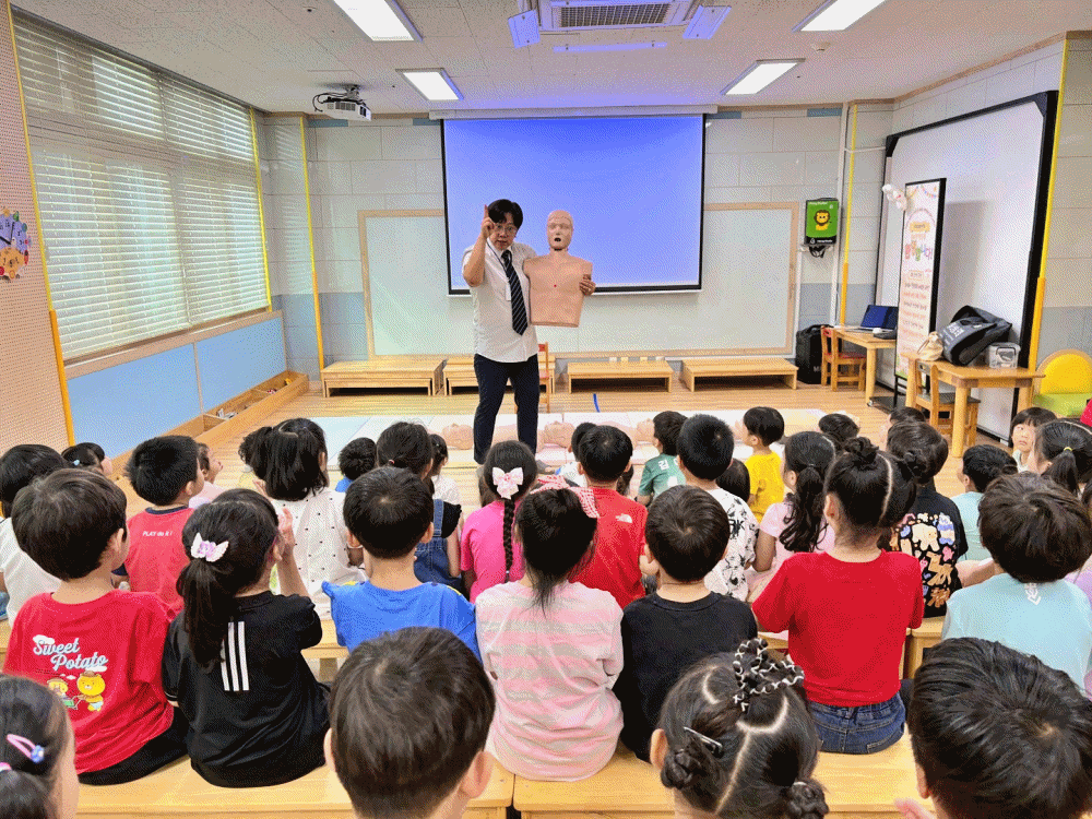 교육에 참여한 유아들은 심폐소생술의 기본 원리를 들은 뒤, 인형 모형을 이용해 ‘가슴 압박하기’를 직접 체험하였다. 작은 손으로 힘껏 양손을 모아 누르며 “심장이 다시 뛸 수 있게 도와주는 거예요!”, “제가 살려줄래요!”라고 말하는 등 적극적이고 진지한 태도로 임하였다. 친구가 도전할 때는 “힘내!”, “더 세게 눌러봐!”라며 응원과 격려를 아끼지 않아 교육 현장은 따뜻하고 활기찬 분위기로 가득했다.