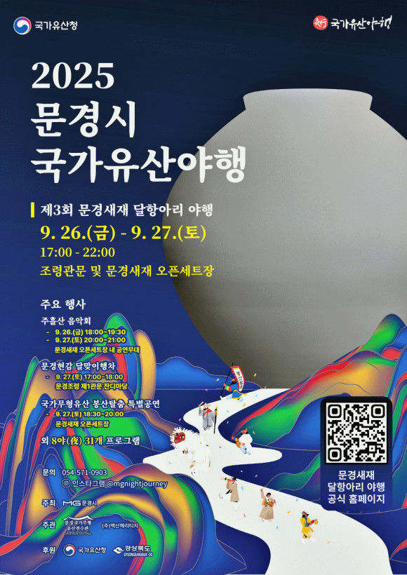 백설매 문화예술과장은 “문경의 자연유산과 역사유적, 그리고 전통을 이어온 장인과 문인들의 무형유산을 문경새재 옛길에 스토리텔링을 통해 선보인다”며 “올해 세 번째로 열리는 문경새재 국가유산 야행에서 가을밤의 정취를 함께 즐기시길 바란다”고 말했다.