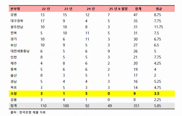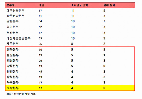 한국은행이 제출한‘최근 3년간 지역본부별 생산 보고서’현황 자료에 따르면, 포항본부는 3년간 9건의 보고서를 발간해 최하위권에 머문 것으로 확인됐다.