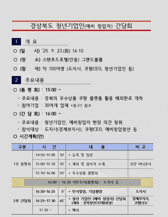 이날 품평회와 간담회에 참석한 이철우 도지사는 “쿠팡은 로켓배송, 쿠팡플레이로 국민의 일상을 바꾼 혁신 플랫폼이다. 경북 청년이 쿠팡에서 새로운 비즈니스 기회를 만들고, 쿠팡은 경북 청년에 투자하는 선순환을 완성한다면, 경북 청년이 미래를 바꾸는 지역혁신 플랫폼이 완성된다”며 “물류, 콘텐츠, 데이터, 그리고 인재까지 협력해 경북과 기업, 청년이 함께 한국을 바꾸는 지역 성장 혁신 생태계를 구축하자”고 강조했다.