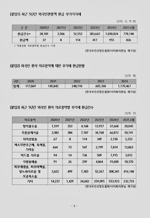 최근 5년간 외국인 환자 유치 역시 급증했다. 국내에서 의료 행위를 받은 외국인 환자는 지난 2020년 11만7069명에서 지난해 117만467명으로 10배 가량 늘었다. 올해 상반기 기준 외국인이 받은 피부, 미용·성형 의료용역 중 가장 많은 환급 건은 피부재생술·피부미백술·항노화치료술 및 모공축소술로 41만6148건을 기록했다.