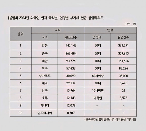 지난해 기준 미용·성형 부가세 환급을 가장 많이 받은 외국인은 일본인으로 집계됐다. 상위 10위 국가 중 일본이 44만5143건 환급으로 가장 많았고, 이어 중국(26만3483건), 대만(9만3776건), 미국(5만7637건), 싱가포르(3만90건), 태국(2만9334건) 순이었다.