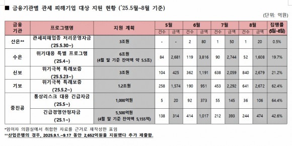 정부가 지난 9월 3일 ‘美 관세협상 후속 지원대책’에서 제시한 여러 금융지원 프로그램 가운데서도 성과가 뒤처졌다. 5월~8월 집행률을 비교하면 수출입은행은 19.7%로, 산업은행(0.5%)에 이어 두 번째로 낮았다. 반면 기술보증기금의 ‘위기극복 특례보증’과 중소벤처기업진흥공단의 ‘통상리스크 대응 긴급자금’은 같은 기간 각각 60% 이상의 수준을 달성해 대조를 보였다.
