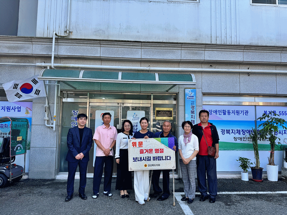 9월 26일 김경숙 도의원은 경상북도의회를 대표해 문경시 소재 경북지체장애인협회 문경시지회, 문경시 시각장애인 등 생활지원센터를 찾아 경북도의회에서 준비한 위문품을 전달하고 관계자들을 격려했다.