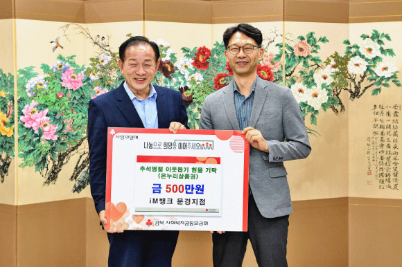 문경시는 지난 9월 23일, 추석 명절을 앞두고 지역 내 소외된 이웃들이 따뜻한 명절을 보낼 수 있도록 iM뱅크 문경지점(지점장 이영우)으로부터 온누리상품권 500만 원 상당을 기탁받았다.