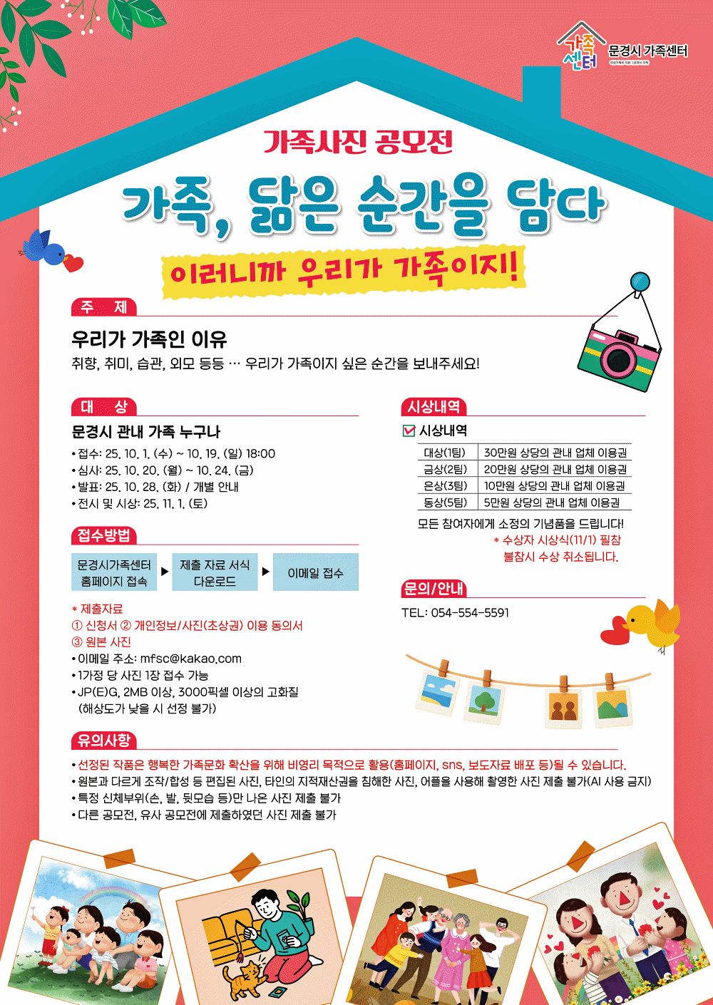 문경시가족센터에서는 온가족보듬사업을 통해 가족 관계 증진과 더불어 구성원 개개인의 역량강화가 이루어 질 수 있도록 상담, 사례관리, 교육문화프로그램 등의 서비스를 제공하고 있으며, 가족사진 공모전의 자세한 참여 방법은 문경시가족센터 홈페이지(https://mungyeong.familynet.or.kr) 및 센터 SNS 등을 통해 확인할 수 있다.
