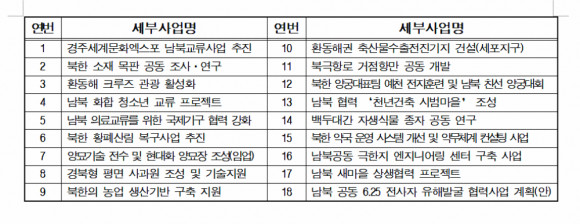 경상북도 남북교류협력사업계획(안)에는 경북도의 강점 분야인 농업, 산림, 문화․관광 등 다양한 분야의 사업들이 포함된 것으로 알려졌다.