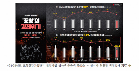 임이자 위원장은 “미국과의 관세 협상 실패로 우리 경제와 수출 어려워지고 있다”며 “철강산업의 생산·수출 모두 큰 폭의 감소세를 보이며 포항 경제도 위기에 처했다”고 지적했다.