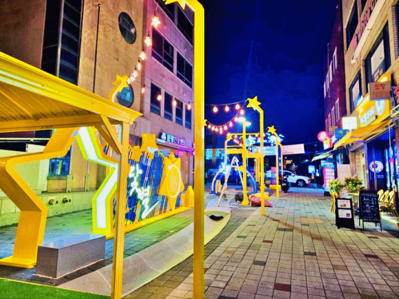 문경시는 점촌원도심상권 130m 구간에 노란색 간판과 어닝을 새로 달고, 상징 조형물 13점, 조형벤치 20개를 설치했으며, 은하수 조명 18m와 360여 개의 파티등으로 ‘닻별 테마길’을 화려하게 완공했다.