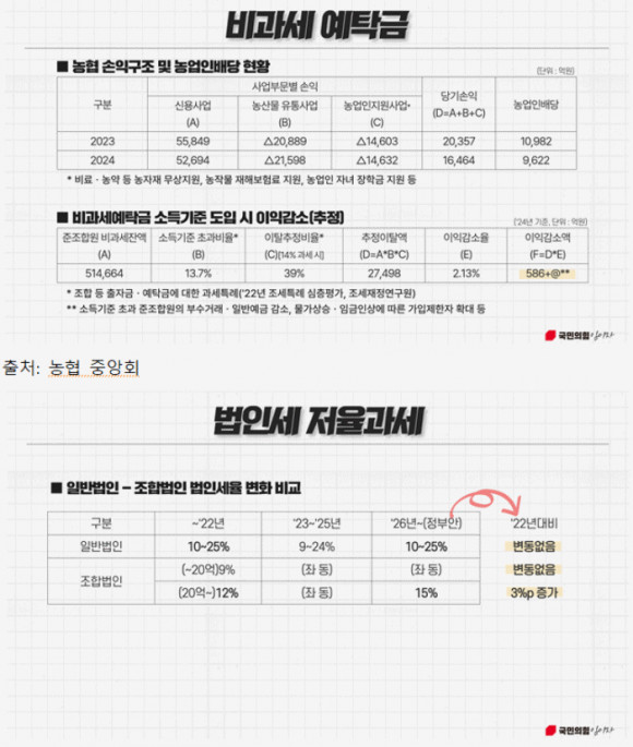 농협은 농업인이 100% 출자한 협동조합 형태의 경제 공동체로, 농협의 모든 재산과 이익금이 곧 농업인 조합원의 재산인데, 정부는 조합법인에 대해 법인세율을 3%p 인상해 세율 변동이 없는 일반법인에 비해 세부담이 더 커지는 불합리한 구조를 만들었다.