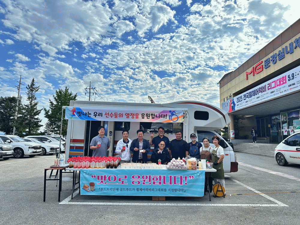 골드푸드단체는 2025 전국휠체어럭비리그대회 폐막전이 열린 문경실내체육관을 찾아 장애인 선수들과 운영진을 위한 푸드트럭 무료 간식 나눔 봉사를 진행하였다.