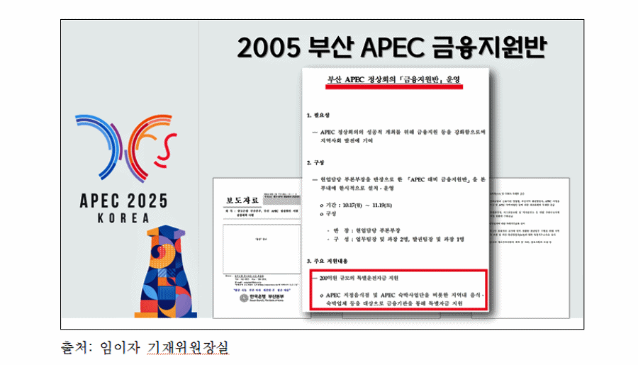 임이자 위원장이 공개한 자료에 따르면, 2005년 10월 13일, 한국은행 부산본부는 보도자료를 통해 “한국은행 부산본부, 부산 APEC 정상회의 지원 종합대책 시행”을 발표했고, 주요 지원내용으로 ▲200억원 규모의 특별운전자금 지원 ▲제조화폐(신권) 및 주화의 무제한 공급 ▲환전영업자에 대한 특별직무교육 실시 ▲금융관련 애로건의사항의 파악 및 처리, 정보사항의 수집 등의 사항이 담겨 있다.