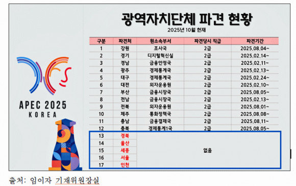 임이자 위원장실이 한국은행으로부터 제출 받은 자료에 따르면, 현재 17개 시·도 중 경북·울산·서울·인천·세종을 제외한 12개 시·도에는 한국은행 2급 직원 각 1명이 파견되어 있다.