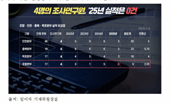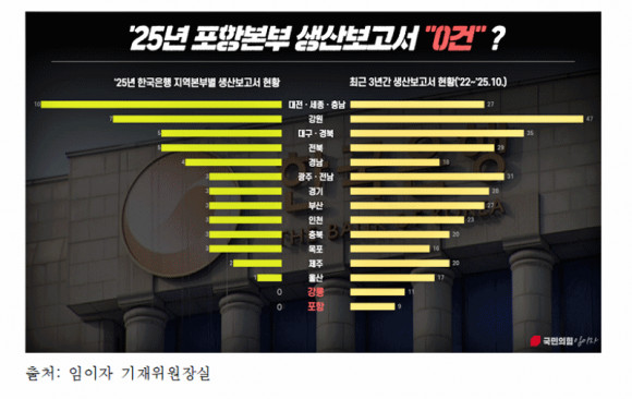 또한, 임이자 위원장은 “조사연구인력이 동일한 인천·충북·목포본부의 경우 올해 3건의 보고서를 발간했다”며, “철강산업의 위기로 포항경제가 위태로운 상황에서 올해 한국은행 포항본부의 조사연구보고서가 단 한 건도 발간하지 않은 것은 업무태만이자, 지역경제에 대한 안일함이 비롯된 것”이라고 꼬집었다.